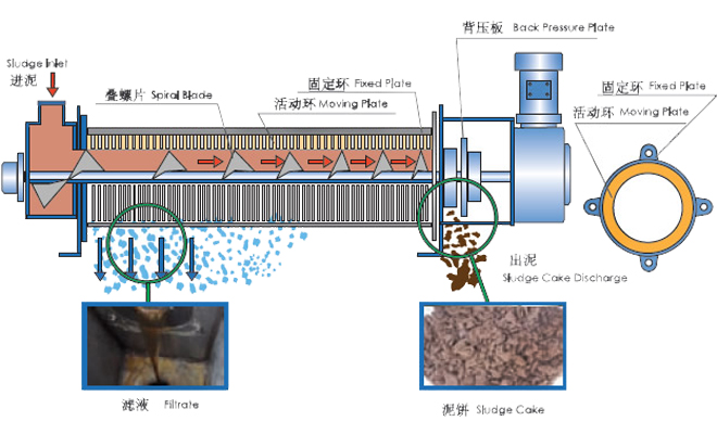 設(shè)備運(yùn)行時,污泥從進(jìn)料口進(jìn)入濾筒后受到螺旋葉片的推送向卸料口移動,由于螺旋軸葉的螺距逐漸縮小,因此污泥所受到的壓力也隨之不斷增加,并在壓力的作用下開始脫水,水從固定環(huán)與游動環(huán)的間隙流出,同時設(shè)備依靠固定環(huán)也游動環(huán)之間的自清洗功能,清掃過濾間隙不易堵塞,泥餅經(jīng)過脫水后在螺旋軸的推進(jìn)作用下從卸料口排出。