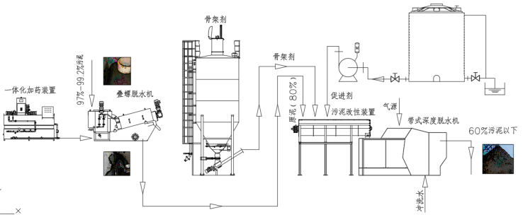 1、經(jīng)過疊螺式污泥脫水機(jī)初級脫水,將含水率99%的污泥降至含水率75%-85%。